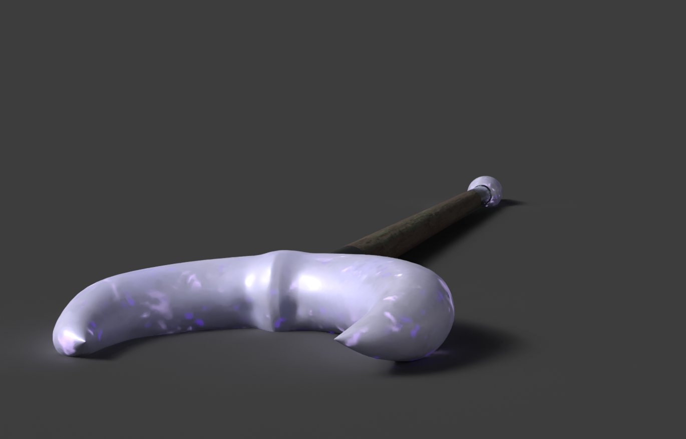 This is my design for a magical weapon used by the antagonist in the story. The crescent moon and tear drop shaped stones on the ends are infused with magical energy, giving it a soft purple color. The middle of the staff is made of wood, and has silver guards attaching the stones to the pole.